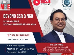 MBE is an NGO, a nonprofit and a social enterprise, with over hundreds members of Myanmar Citizens MBA Graduates and a network of more than 2000 responsible entrepreneurs and executives, with the mission to promote sustainable business development in Myanmar.