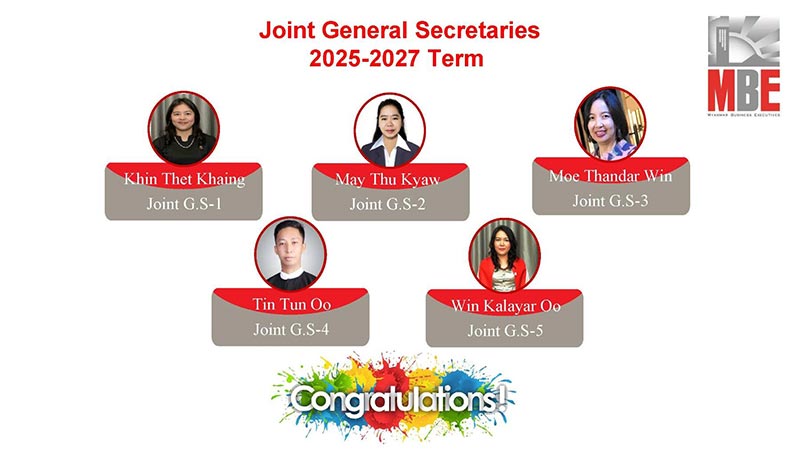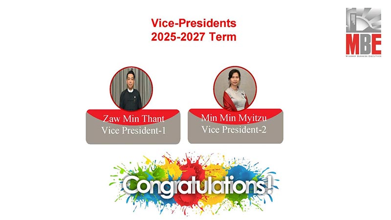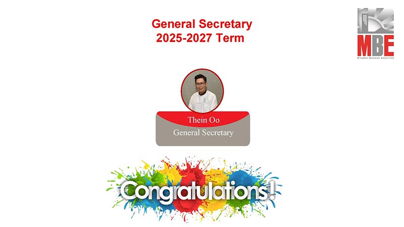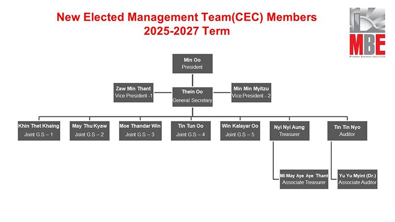 မြန်မာစီးပွားစီမံအမှုဆောင်များအသင်း (MBE) ၏ (၂၀၂၅-၂၀၂၇) သက်တမ်း အသင်း စီမံခန့်ခွဲမှုအဖွဲ့ (ဗဟို အလုပ်အမှုဆောင်အဖွဲ့) ရာထူးတာဝန်များ ရွေးချယ် တင်မြှောက်ပွဲ အခမ်းအနားကို ယနေ့ (၁၈-၁၀-၂၀၂၅) ရက်နေ့၊ မွန်းလွဲပိုင်းက ရန်ကုန်မြို့တွင် Hybrid (In Person & Online) စနစ်ဖြင့် ကျင်းပခဲ့ရာ MBE အသင်း (၂၀၂၅-၂၀၂၇) သက်တမ်း အလုပ်အမှုဆောင် ရွေးချယ် တင်မြှောက်ရေးကော်မရှင် အဖွဲ့ဝင်များ၊ (၂၀၂၅-၂၀၂၇) သက်တမ်း တာဝန်ထမ်းဆောင်ကြမည့် အလုပ်အမှုဆောင် (၄၁) ဦး၊ အသင်းရုံးအဖွဲ့ ဝန်ထမ်းများ စုံညီစွာ တက်ရောက်ခဲ့ကြပါသည်။