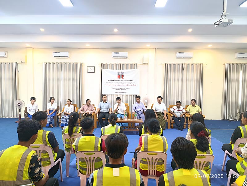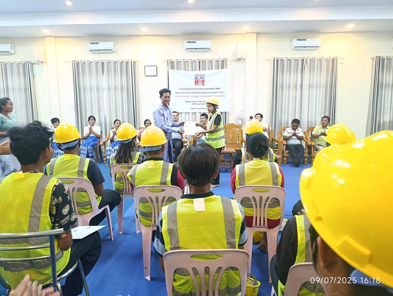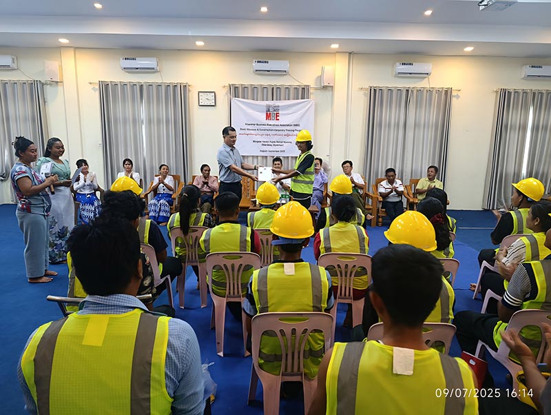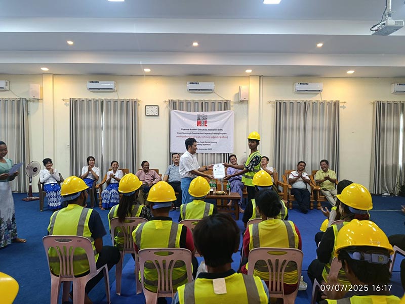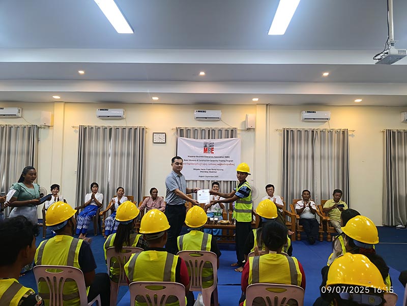 “အသက်မွေး ဝမ်းကျောင်းပညာ ပန်းရံ အုတ်စီ အခြေခံ သင်တန်း အပတ်စဉ် (၂)” အောင်မြင်စွာ ပြီးမြောက်ခြင်း နှင့်အတူ သင်တန်းသား/သူ (၂၀) ဦးထံ သင်တန်းဆင်း လက်မှတ်များ ပေးအပ်ခြင်းကို မြန်မာစီးပွားစီမံ အမှုဆောင်များအသင်း (MBE) က (၂၀၂၅) ခုနှစ်၊ စက်တင်ဘာလ (၇) ရက် ညနေပိုင်း၌ ဆောင်ရွက်ခဲ့ပါသည်။